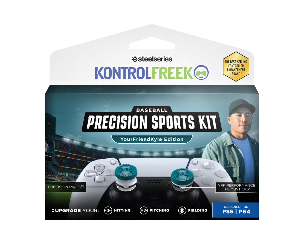 Play like YourFriendKyle, one of the top console baseball players, with custom YFK Performance Thumbsticks® and Precision Rings™. This performance-enhancing combo provides extra grip, control, and stick resistance so you can hit and pitch like a pro! Precision Rings and the high-rise left stick give you finer PCI control for more home runs, while the mid-rise right stick sharpens your accuracy on the mound, helping you paint the corners pitch after pitch. Featuring non-slip, laser-etched GripTek™ material and three levels of ring resistance to customize your swing, this kit is the ultimate "cheat code" to help you start wheeling and dealing your way to the World Series.
